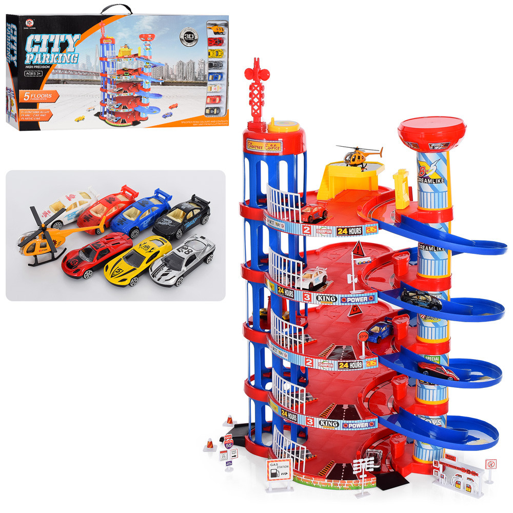 Гараж 0908-56B 5 поверхів, транспорт 8шт. (4-мет.), дорож.знаки, рухомі.дет., Кор., 73-39-11,5см.